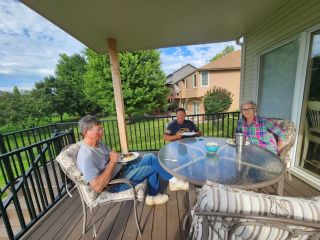 Sitting with my brother and his wife,  chowing down on the deck.  Reunions are hard work!  >>